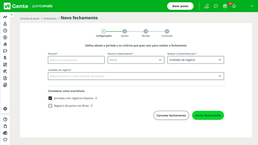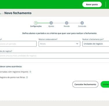 O fechamento de ponto é uma funcionalidade central do sistema, responsável por consolidar cálculos como horas extras, banco de horas e regras de convenção coletiva.