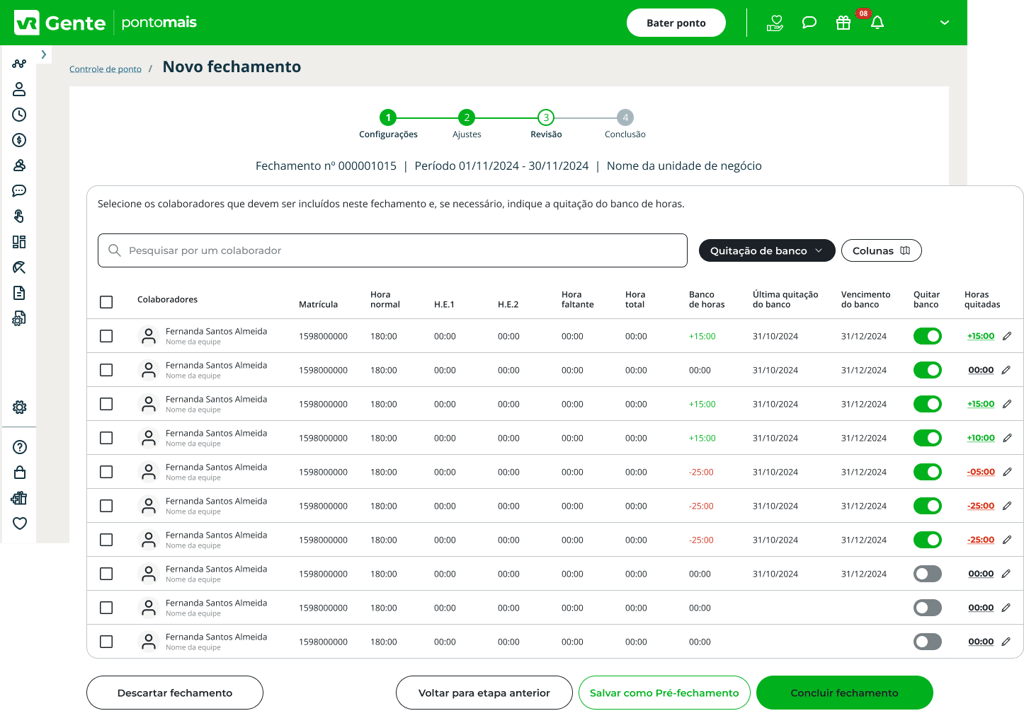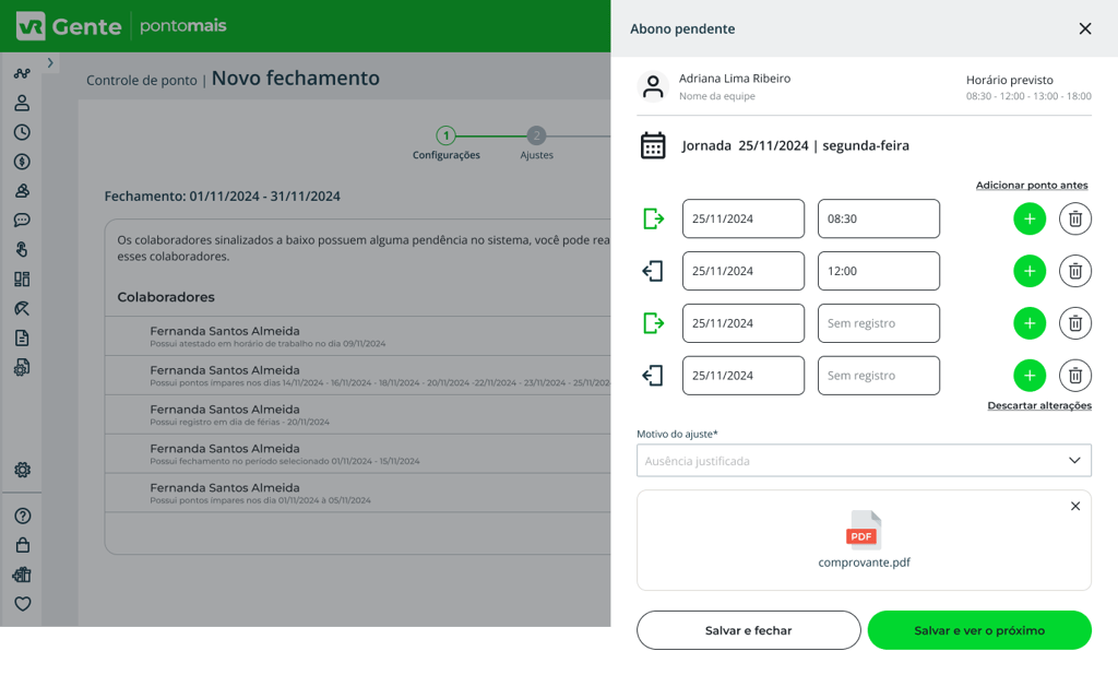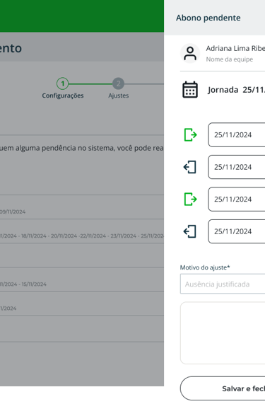 Os ajustes passaram a ser realizados dentro do próprio fechamento, por meio de um painel lateral, permitindo que o usuário corrigisse as pendências dos colaboradores sem sair do fluxo. Isso reduziu a necessidade de navegação externa e simplificou a execução, tornando o processo mais direto e contínuo.