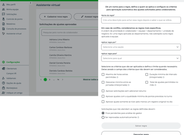 O fluxo de criação de regras foi desenhado para dar ao gestor controle total sobre quando e como o Assistente Virtual deve atuar. É possível definir a quem a regra se aplica e quais critérios determinam a aprovação automática dos ajustes.